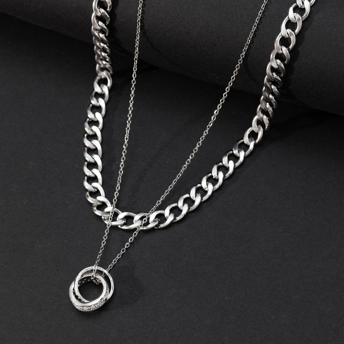 Pendant: Two interlocking polished rings—one smooth and one subtly textured.