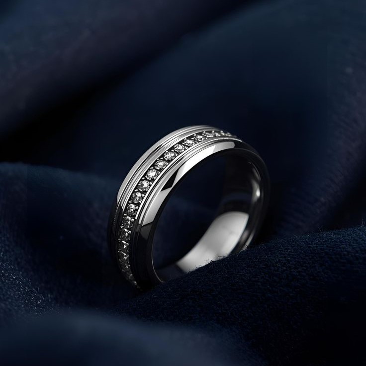 The contrast between the glossy metal and the diamond channel creates a bold yet elegant look—perfect for weddings, engagements, anniversaries, or elevated everyday wear. Designed for comfort and durability, this ring blends modern masculinity with timeless sophistication.