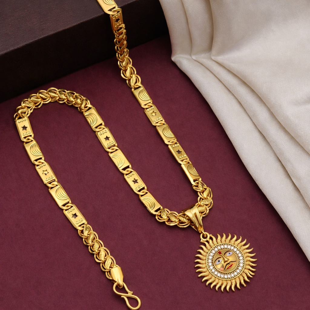 Embrace power, tradition, and luxury with this men’s gold Sun God pendant chain, inspired by timeless symbolism and bold craftsmanship. The pendant features a majestic sun face design surrounded by radiant sun rays and accented with a sparkling stone-studded border, giving it a commanding and divine presence.