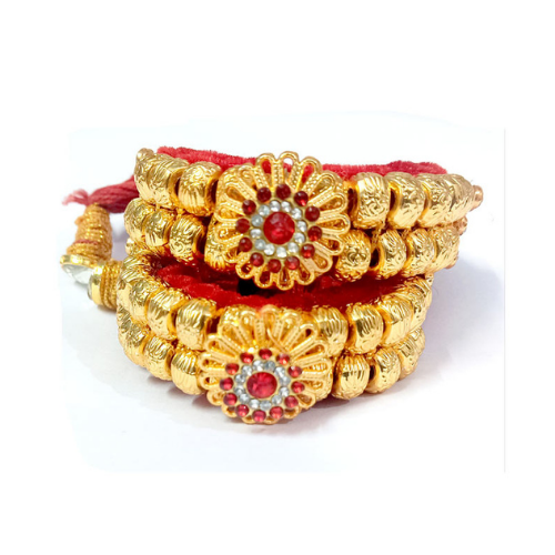 This stunning bridal Pahunchi features lotus-inspired floral kundan motifs at the center, adding elegance to the traditional beaded structure. The combination of red stones and handcrafted beads makes it a perfect choice for brides looking for a royal and auspicious accessory. Its luxurious shine and neat detailing bring a majestic touch to mehendi, wedding, and reception looks.