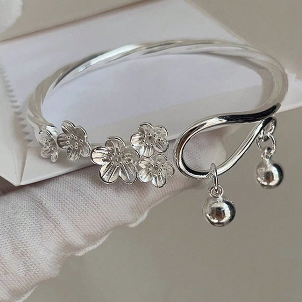 Description: Step into a garden of silver with our Sakura Symphony Bangle. This stunning open-cuff piece features a cluster of meticulously detailed cherry blossoms that appear to bloom right from your wrist. The sculptural silver band flows into a graceful loop, from which two polished “harmony ball” bells delicately hang, adding a subtle, rhythmic chime to your every movement. Bold, artistic, and deeply symbolic, this bangle is more than an accessory—it’s a conversation piece.