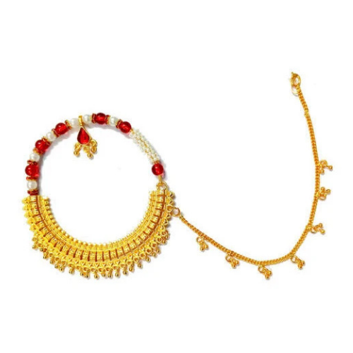 Traditional Pahadi Bridal Nath – Red Bead Golden Nath