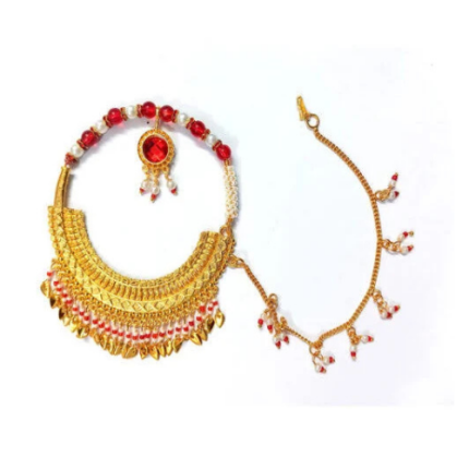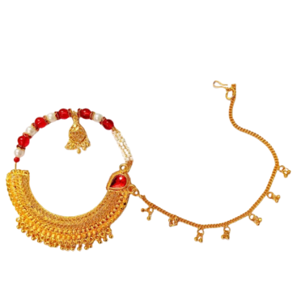Traditional Pahadi Bridal Nath – Red Bead Golden Nath